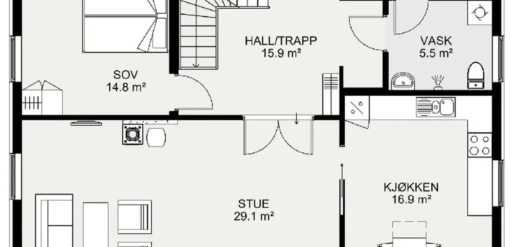 Velger du Mesterhus Kine med allromsløsning, får du god plass til en egen frokostkrok og et langbord for familie og venner. Du kan også legge til en peis, for de som drømmer om det.