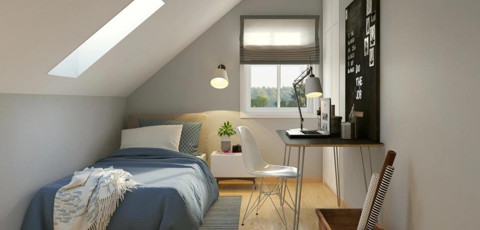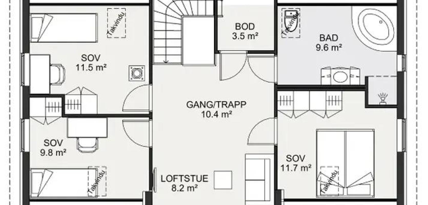 I andre etasje finner du tre soverom, et stort og flott bad, samt en romslig bod. Denne etasjen har også en egen loftstue som kan fungere som en TV-stue og oppholdsrom. Loftstuen er også et flott sted for barna å ha venner på besøk. Dersom du ikke har behov for så mye plass i starten, kan du velge å vente med å innrede andre etasje.
