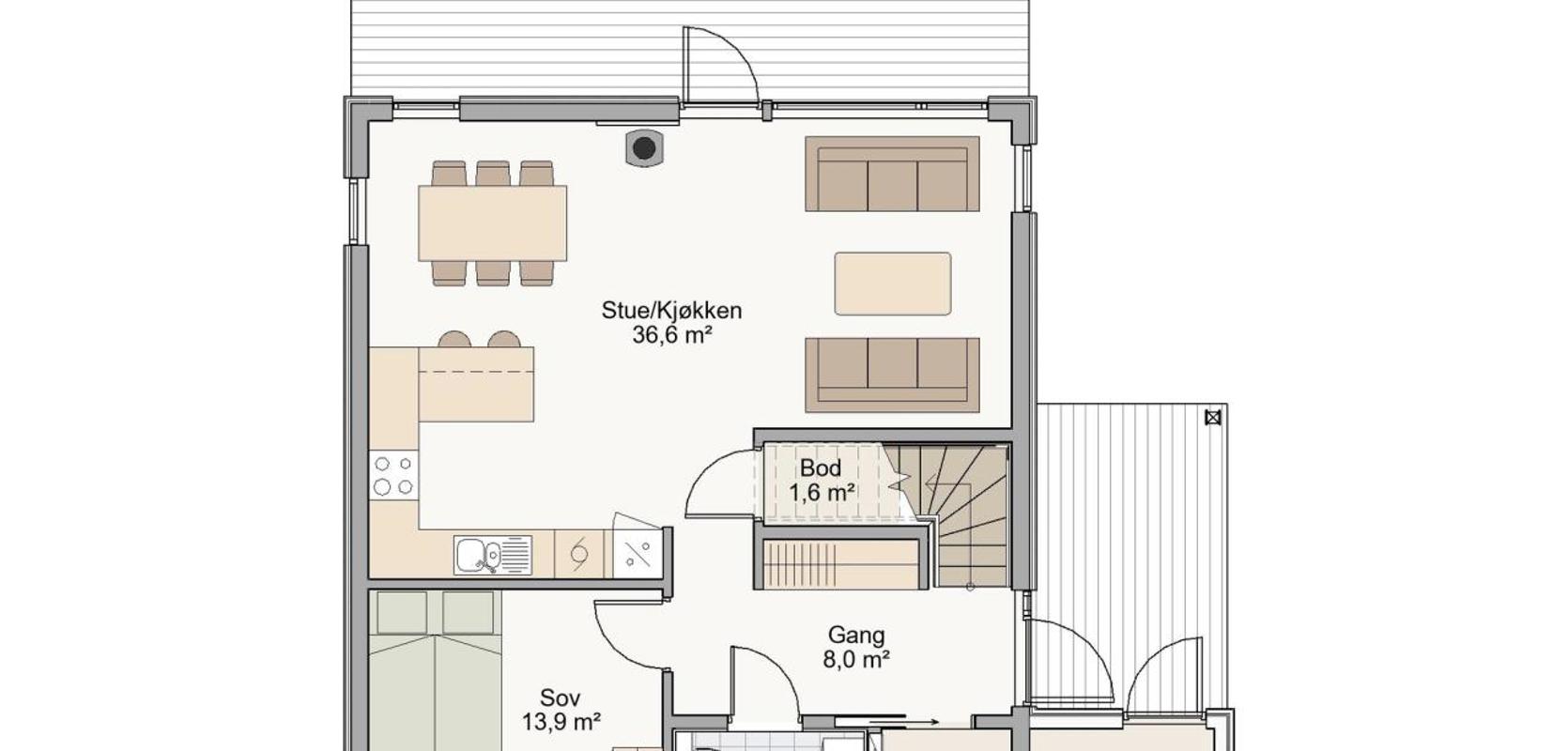 Huset har pulttak og skrå himling, slik at man i andre etasje får en flott takhøyde på loftstuen. Det er to balkonger ut ifra andre etasjen, slik at man kan velge hele dagen om man ønsker å følge sola eller skyggen. Balkongen ut fra loftstuen er overbygd og har vegger på to kanter. Det gjør balkongen lun og fin. Glassrekkeverket gjør at den allikevel føles luftig. Andre etasjen har også tre soverom og et bad.
