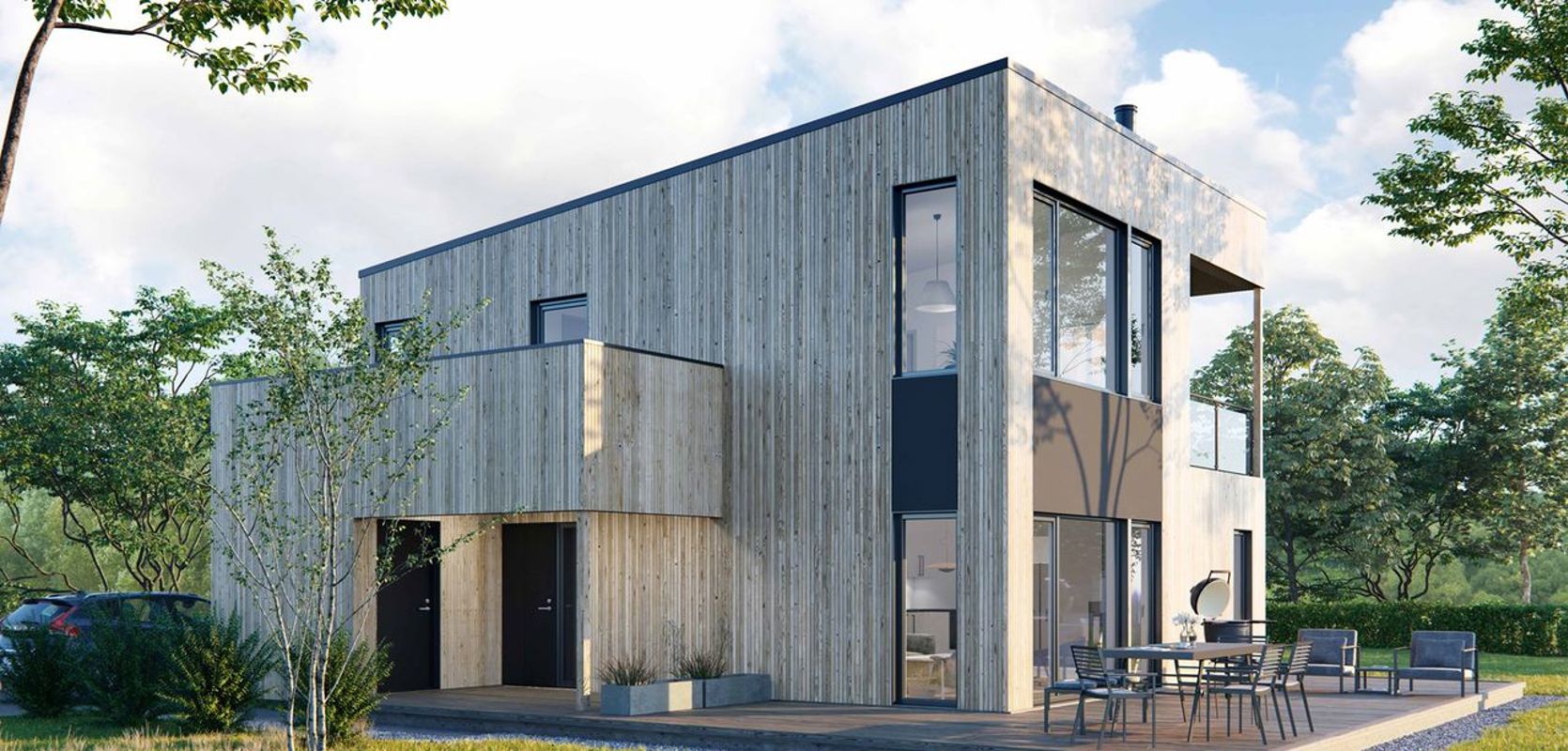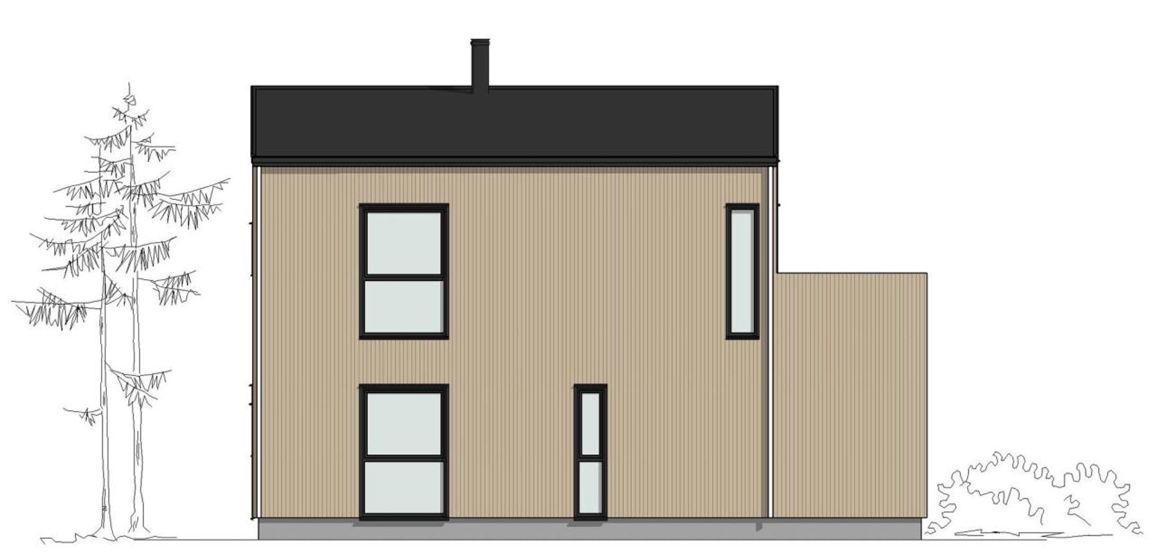 Skansen er et moderne hus med store vindusflater, pulttak og elegant stående trekledning. Samtidig som huset er svært stilig, har det alt en familie trenger.