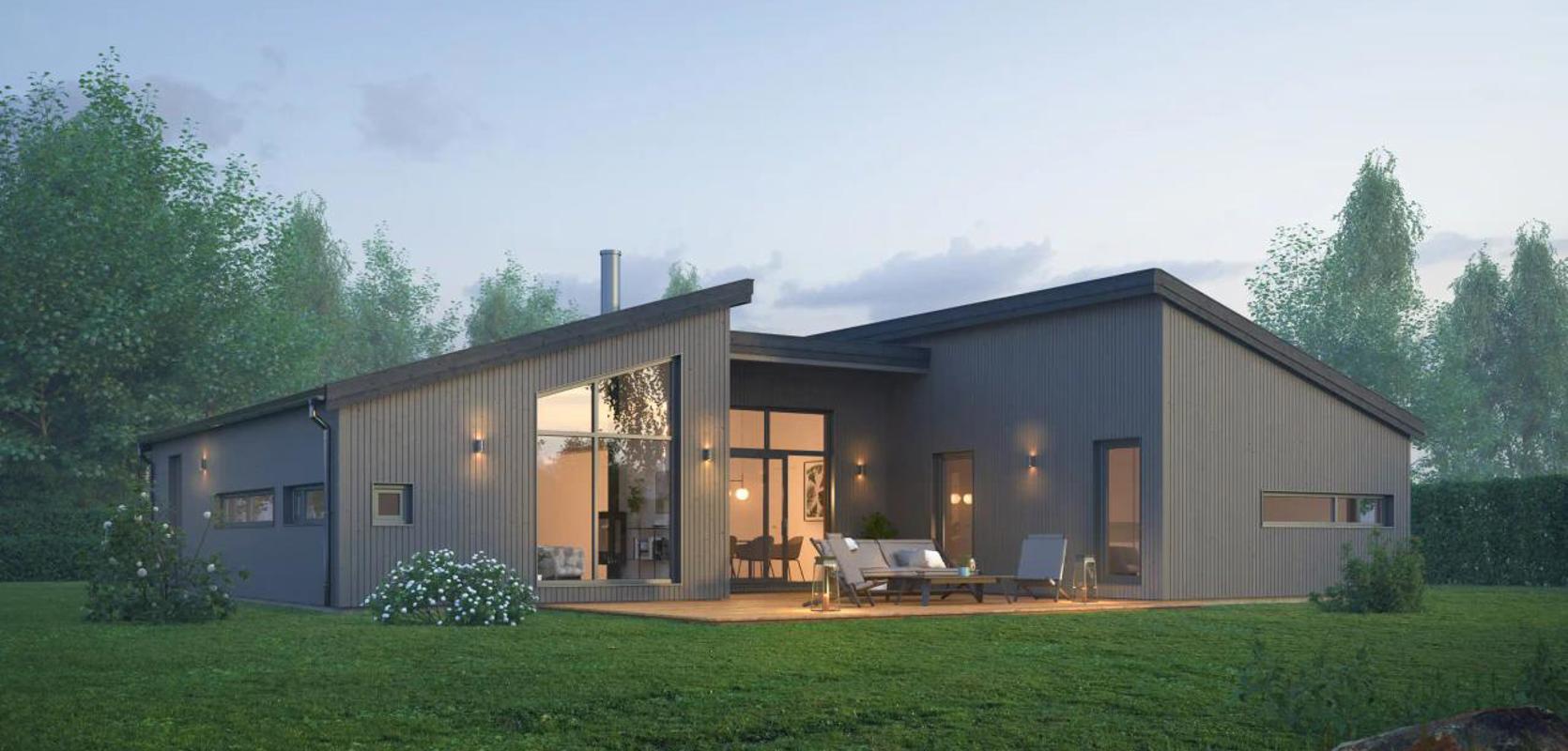 Huset har to fløyer som er harmonisk sammenflettet i midten av boligen. Her finner du et vindfang, en bod, et gjestebad og spisestue som du kommer inn til fra vindfanget. Sammen skaper fløyene et koselig og skjermet uterom midt i huset.