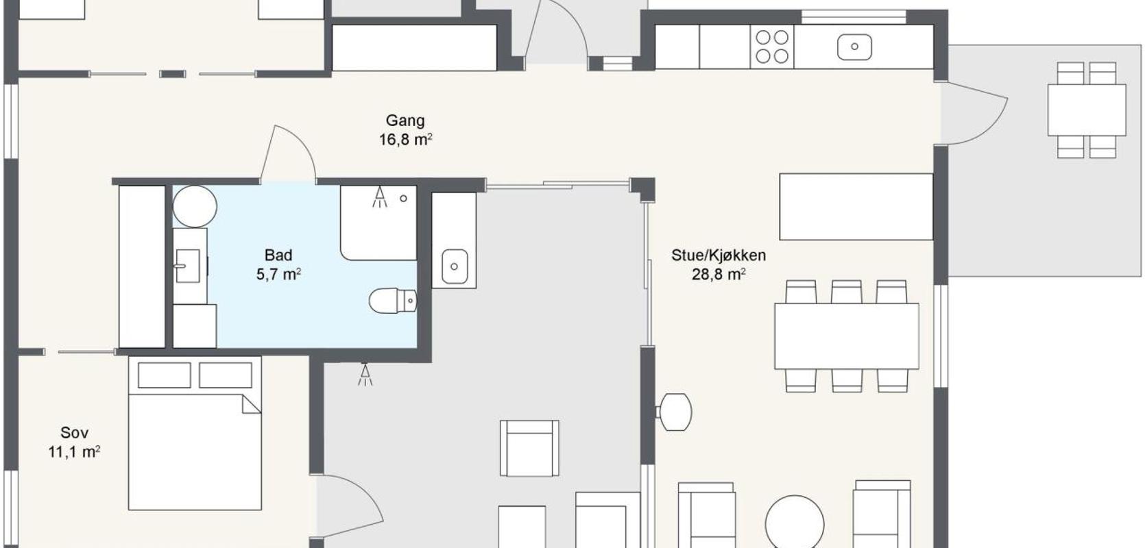 Hva med å nyte morgenkaffen ute? I den åpne stue- og kjøkkenløsningen er det direkte utgang fra kjøkkenet til en uteplass i øst med en overbygd pergola. Kjøkkenet har godt med lysinnslipp og god oversikt i alle retninger i hytta, med naturlig lys som strømmer inn fra gangpassasjen i vest, ut mot pergolaen i øst, ut mot inngangspartiet i nord, og selvfølgelig ut mot atriumet i sør.